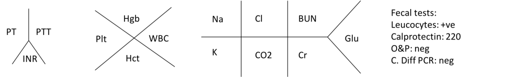 Excellent choice! Patient has bloody diarrhea with labs showing anemia, thrombocytosis, presence of fecal leucocytes and raised fecal calprotectin, which are all concerning for inflammatory bowel disease. Colonoscopy will allow for mucosal inspection and tissue sampling to help confirm the diagnosis and characterize extent and severity.